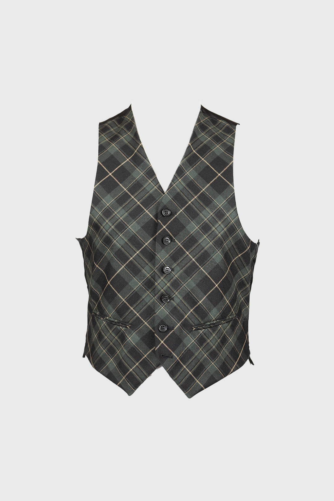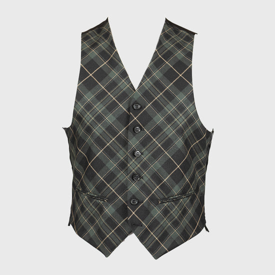 A cut on the cross Hunting Pride tartan waistcoat with 6 buttons and 2 low jetted pockets. To be worn with high-rise waisted trews or kilt.