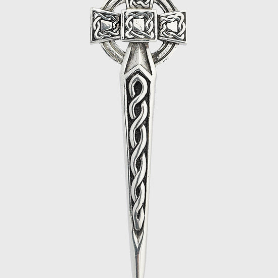 This striking Celtic Cross kilt pin is crafted with intricate detailing that showcases timeless Celtic heritage.