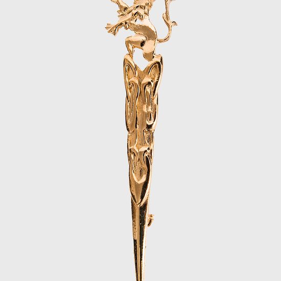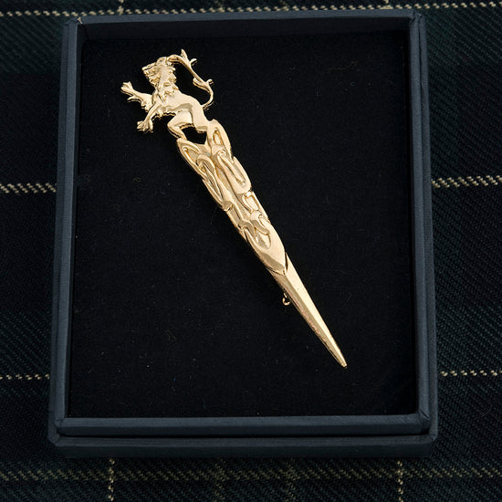 Add a distinctive finishing touch to your kilt outfit with this Pride Lion and Sword kilt pin. Expertly handcrafted from high-quality pewter in a gold finish, this striking accessory is designed to stand out.