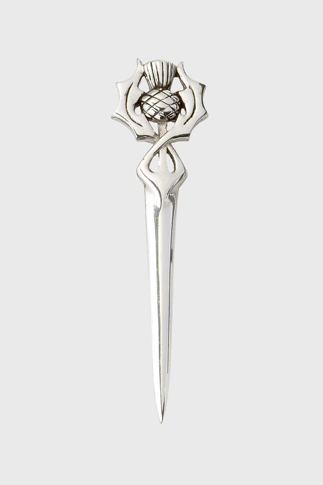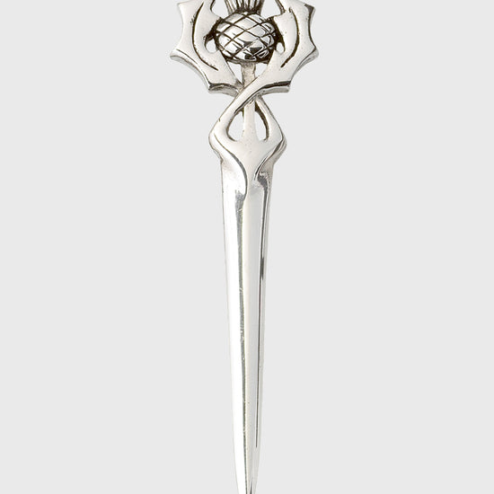 Add a distinctive finishing touch to your kilt outfit with this Twisted Leaf Thistle kilt pin. Expertly handcrafted from high-quality materials in a polished pewter finish, this striking accessory is designed to stand out.