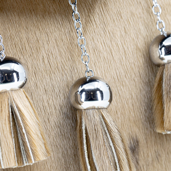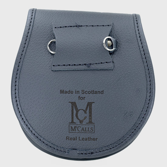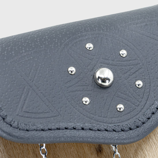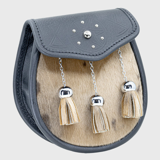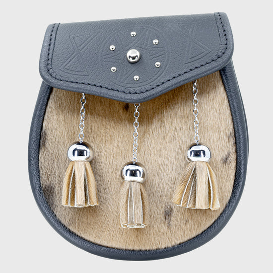 A traditional style black leather and beige sealskin semi-dress sporran, featuring three tassels on chrome chains with matching tassel tops. The front is enhanced with a laser-etched Celtic design accented by subtle stud detailing, giving it a refined Highland look. Crafted with traditional techniques, this sporran blends heritage style with practical functionality, making it ideal for both formal and semi-formal occasions.