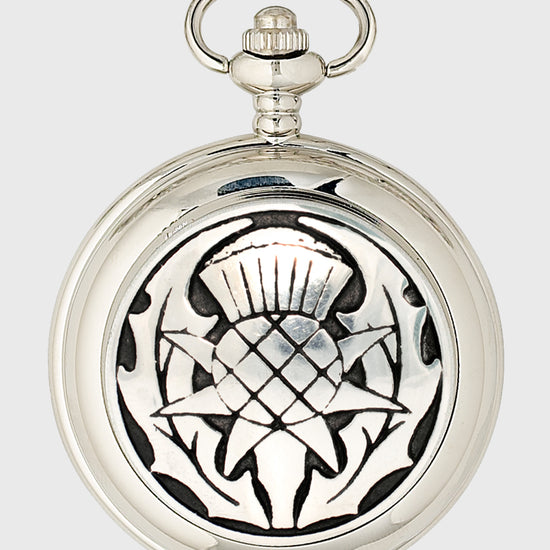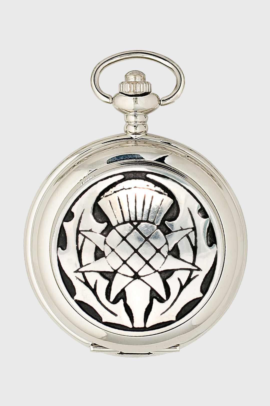 This elegant pocket watch will enhance any kilt or other dress outfit. The mechanical watch is a 17 jewell full hunter with both sides opening.