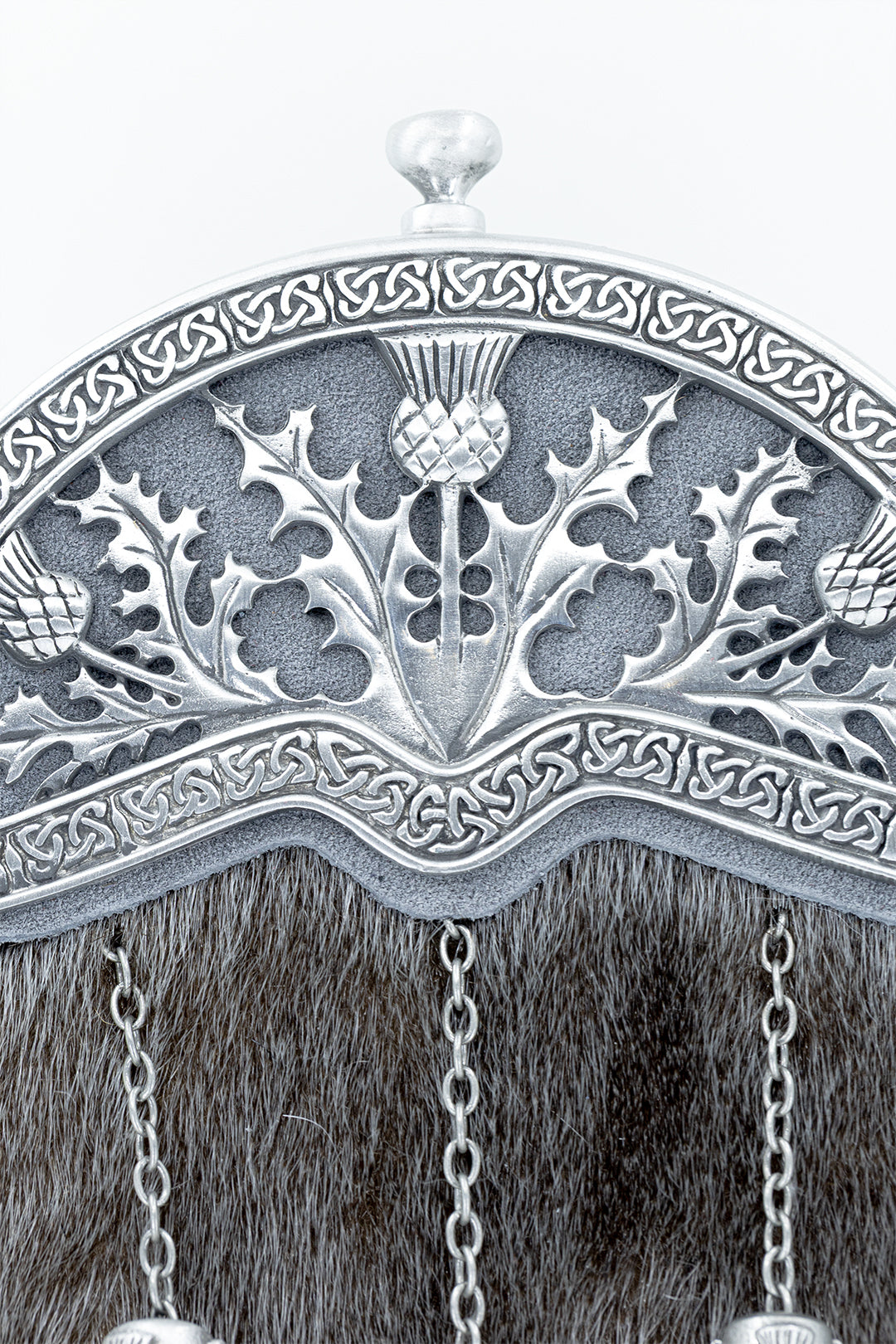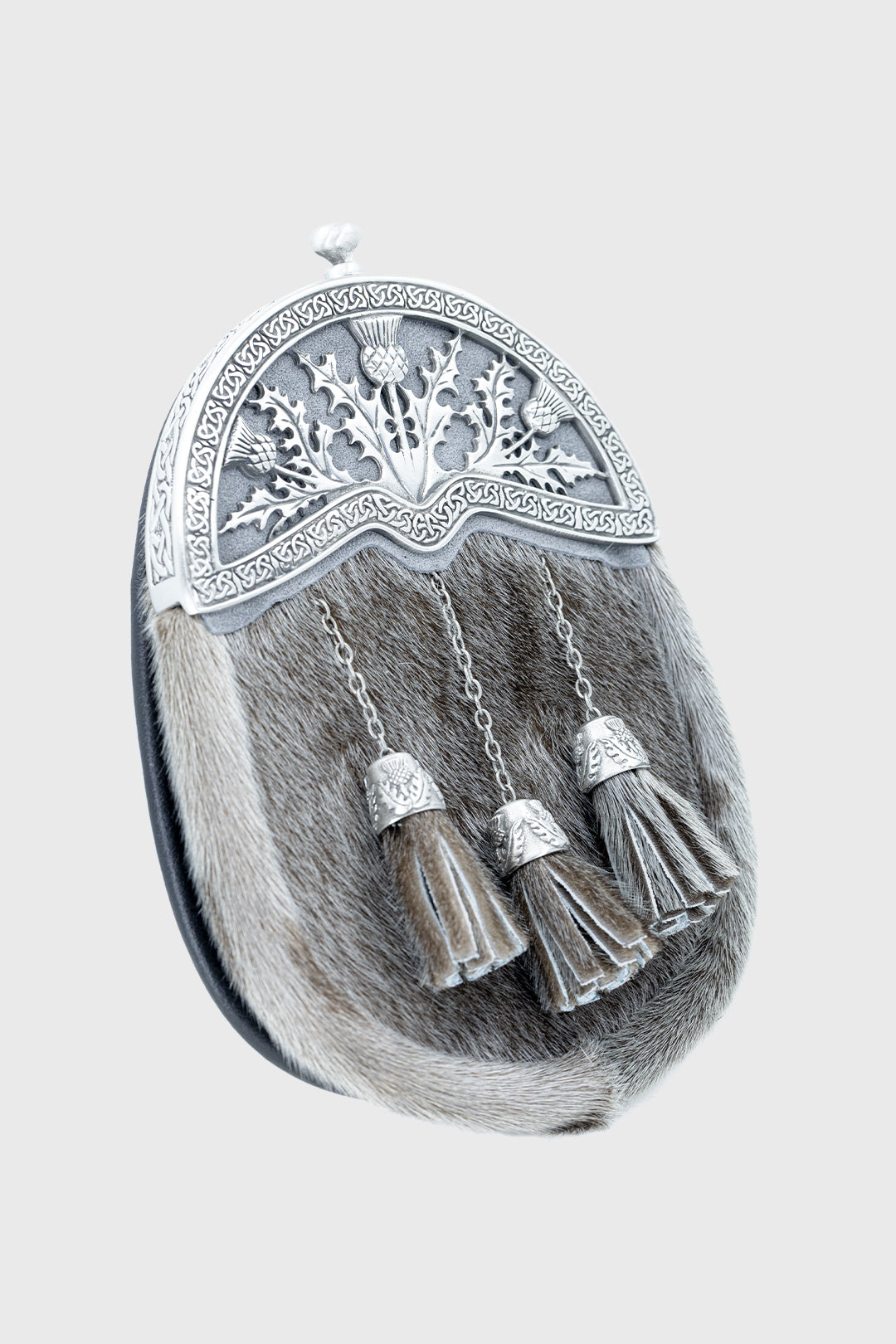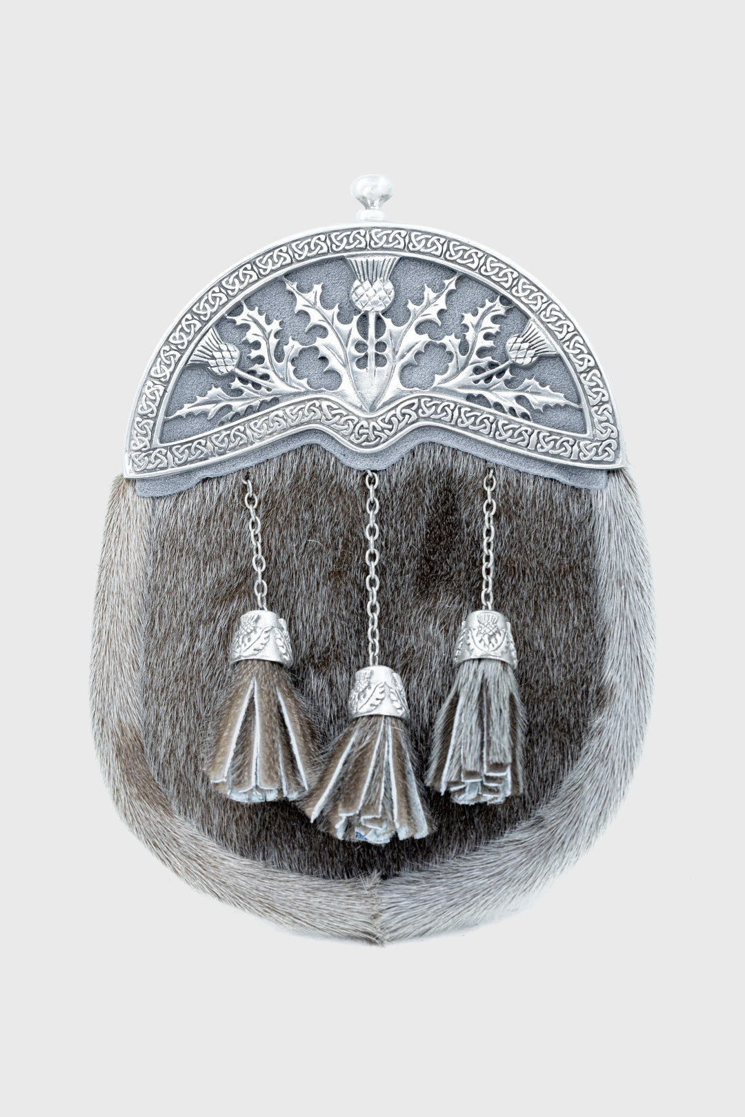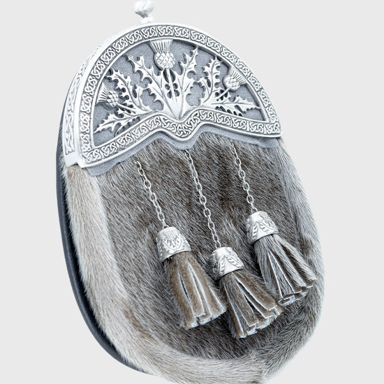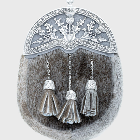 Handcrafted from genuine mid-grey seal skin, this elegant dress sporran features a finely detailed thistle-design cantle, set against a soft grey suede backing for contrast and refinement. Three matching tassels with complementing tops complete its traditional Highland look.