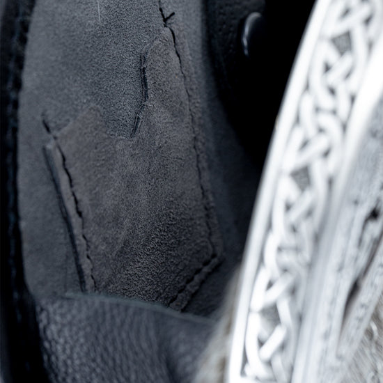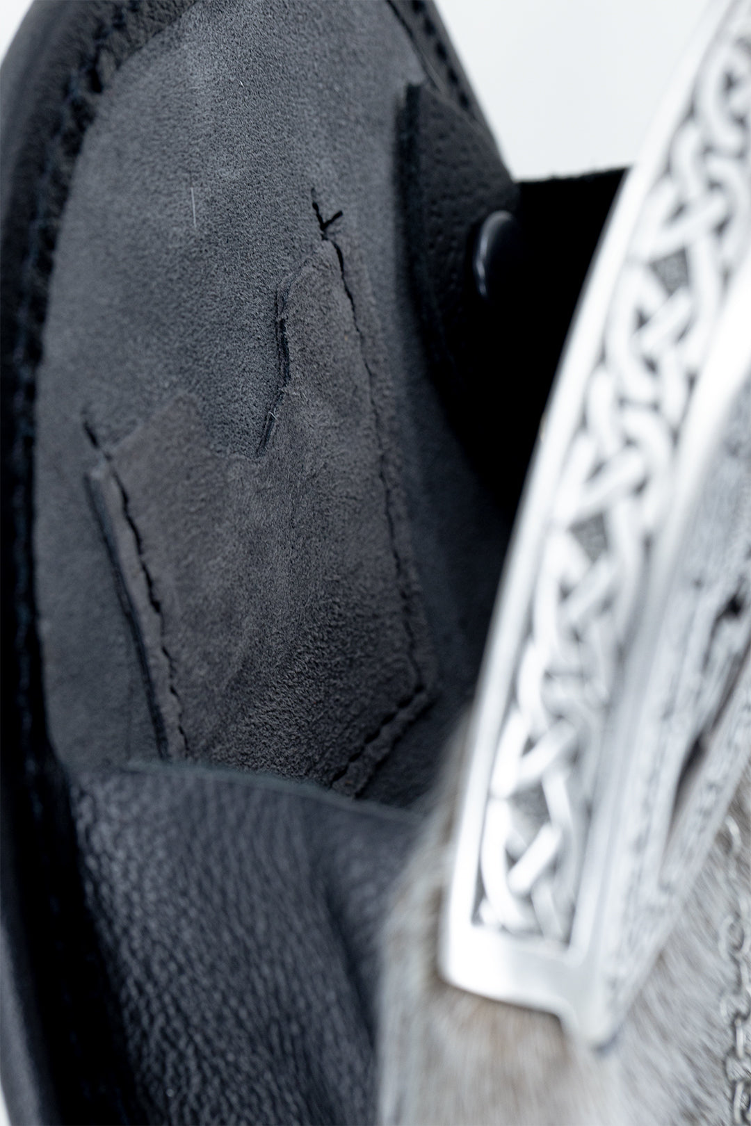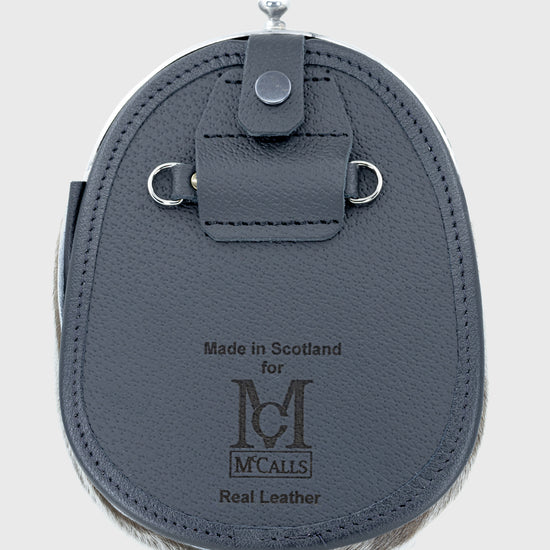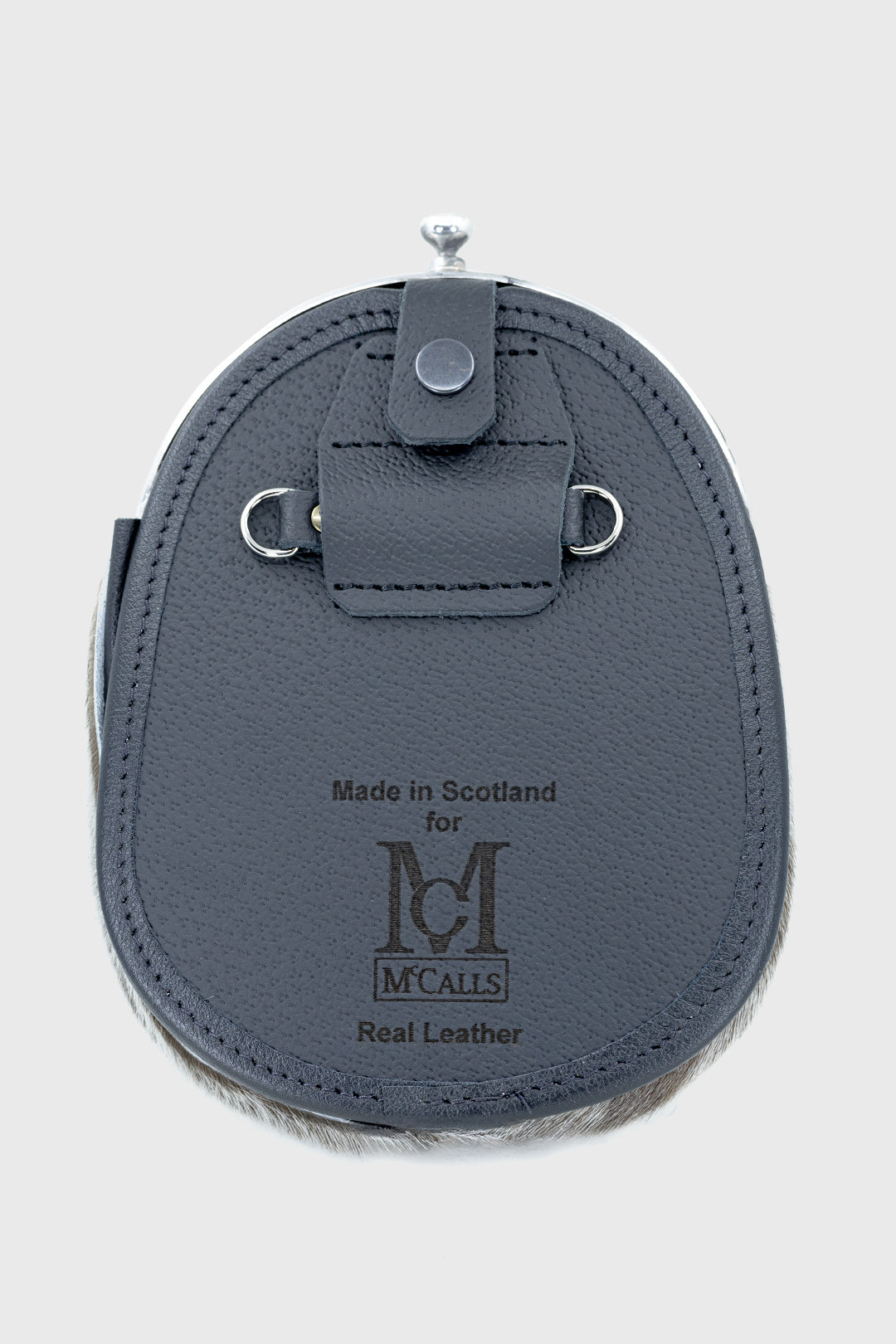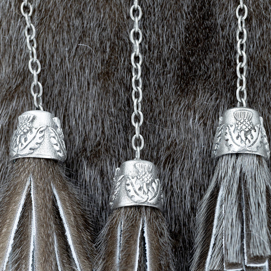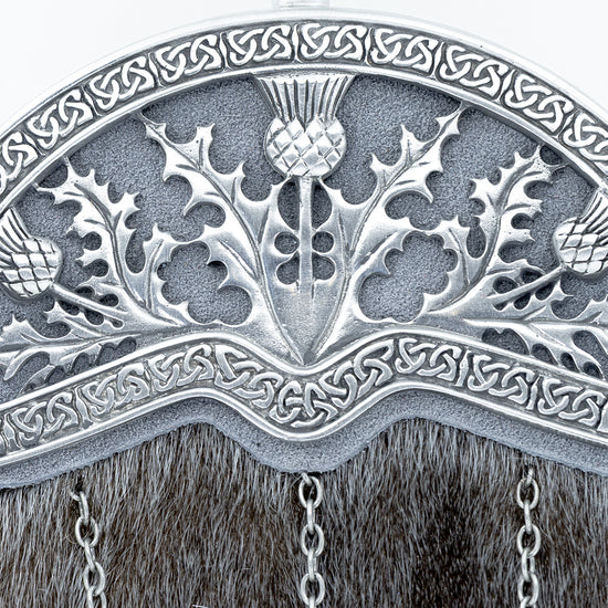 Handcrafted from genuine mid-grey seal skin, this elegant dress sporran features a finely detailed thistle-design cantle, set against a soft grey suede backing for contrast and refinement. Three matching tassels with complementing tops complete its traditional Highland look.