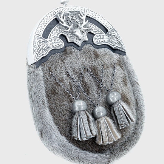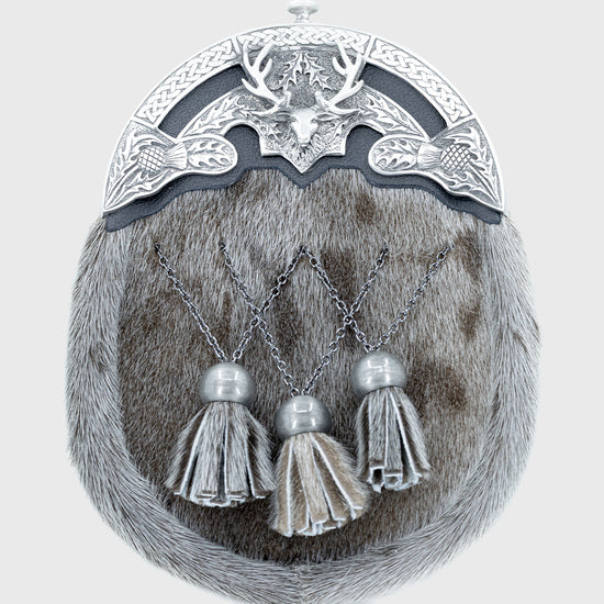 This distinguished Mid-Grey Seal Dress Sporran is crafted from seal skin and finished with a finely detailed stag-design cantle, set against a grey suede backing for added depth and contrast. Three matching tassels with complementing tops enhance its traditional Highland style, making it the perfect accessory for weddings, formal gatherings, and ceremonial occasions.