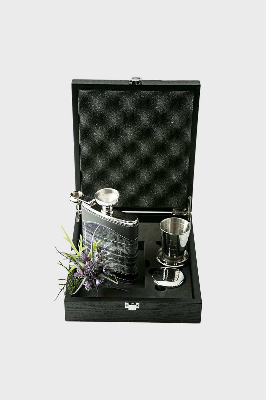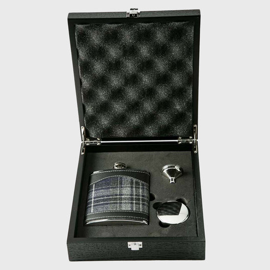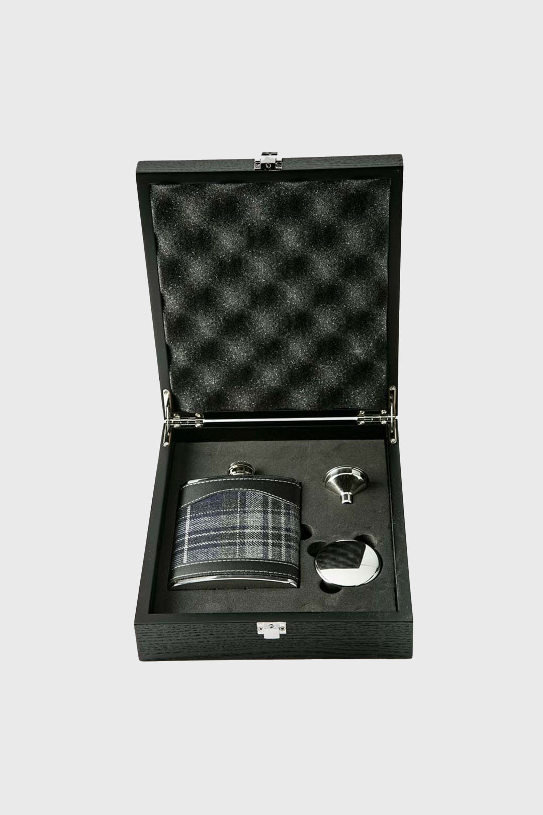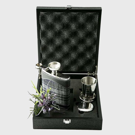 Dark, refined, and contemporary, the Midnight Pride hip flask set pairs a stainless steel flask wrapped in deep navy tartan with a funnel and collapsible cup. Presented in a sleek black wood-effect box, it’s understated elegance at its best.
