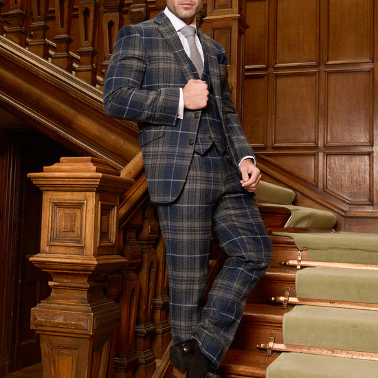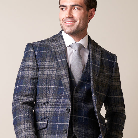 Sleek and sophisticated, the Midnight Pride jacket is tailored from rich tartan in deep navy and grey tones with a check of white throughout. Its sharp cut and timeless style, brings a contemporary edge to traditional Highland dress — equally at home, formal occasions or refined evening gatherings.