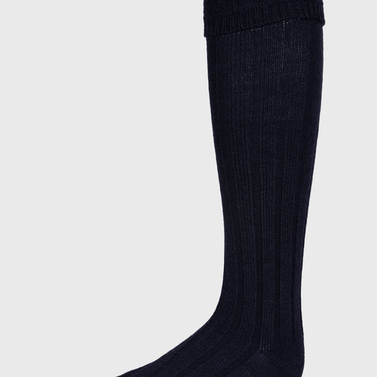Navy wool mix socks with a plain leg and a slight square pattern top.