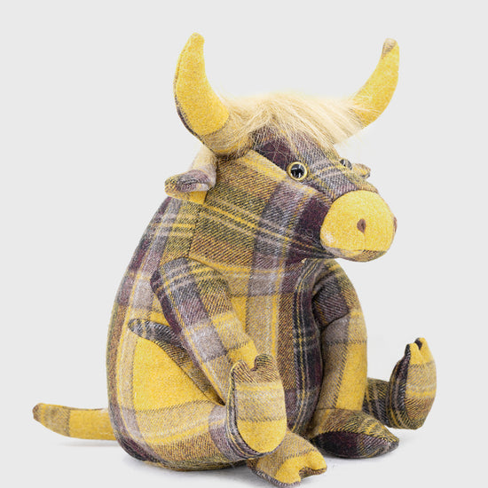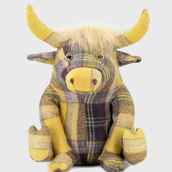 Meet our Patchwork Highland Cow Doorstop. Crafted from a mix of complementary fabrics, his rusty orange velveteen body sits alongside navy, red and green tartan checks, reflecting his Scottish heritage. A patch of soft faux fur forms his forelock, adding charm and character.