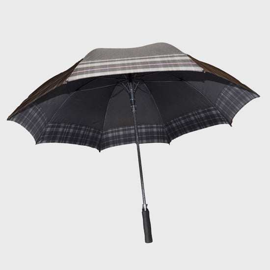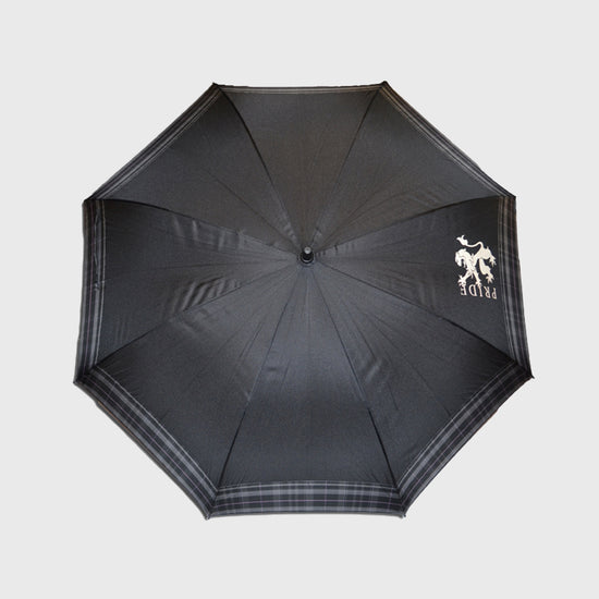 An automatic golf umbrella with Pride logo and Platinum pride trim. Matching sleeve included with 2 long handles for ease of carrying.