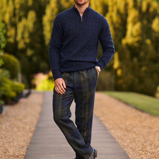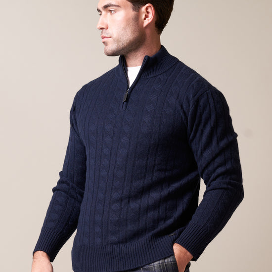The classic cable knit pattern adds timeless texture, while the quarter-zip collar provides versatile styling — wear it zipped up for cosy winter layering or open over a shirt for a relaxed, smart-casual look. Finished in a rich navy colour, this wool and cashmere jumper pairs effortlessly with jeans, tailored trousers, or Highlandwear, making it a stylish and practical choice for everyday wear or special occasions.