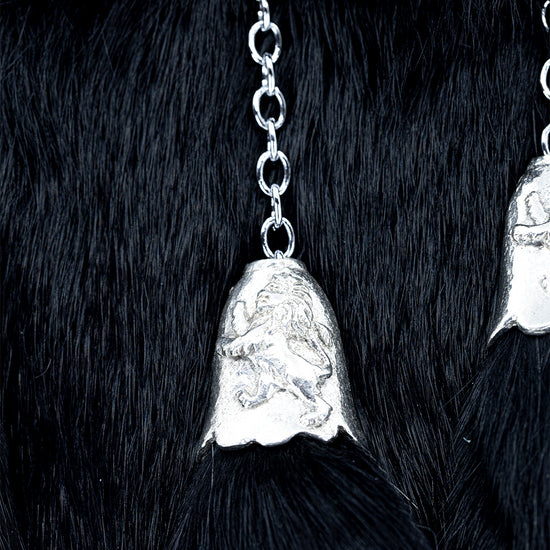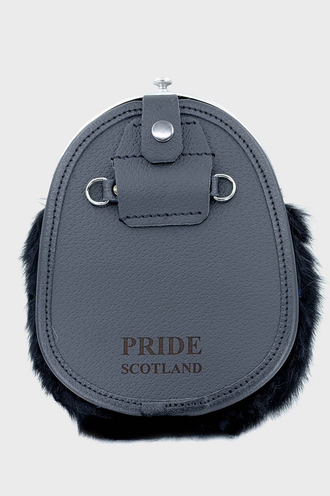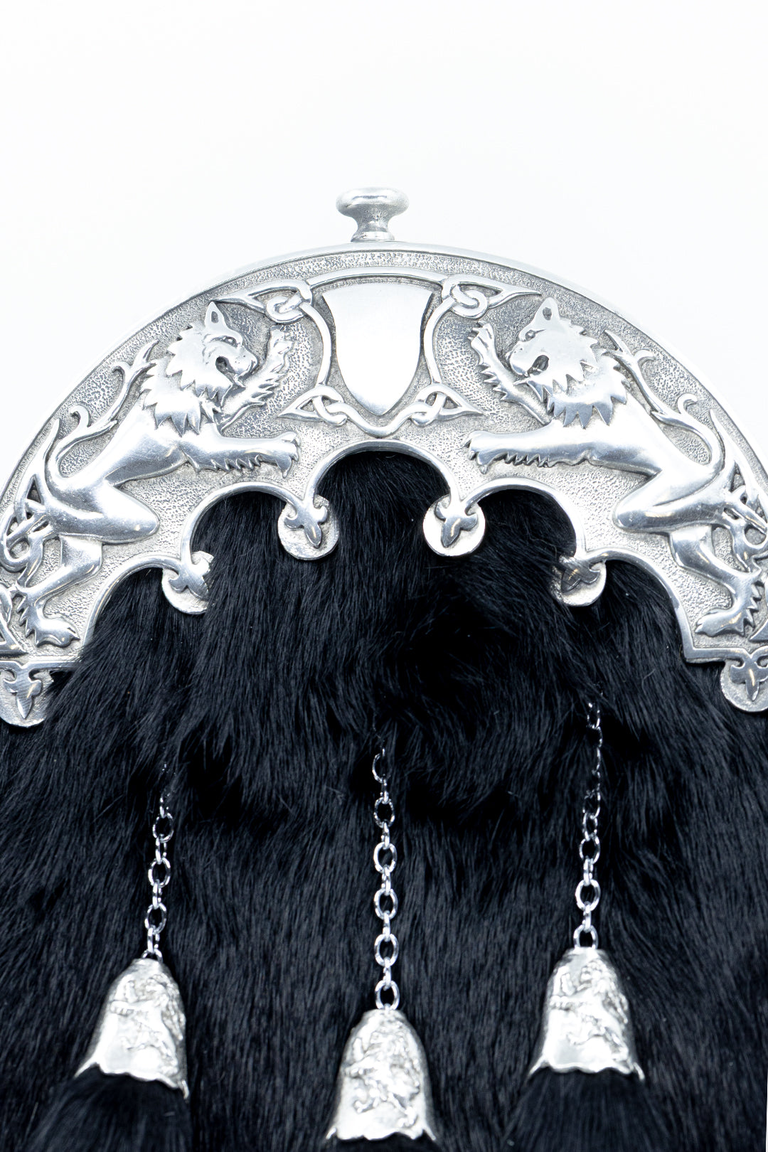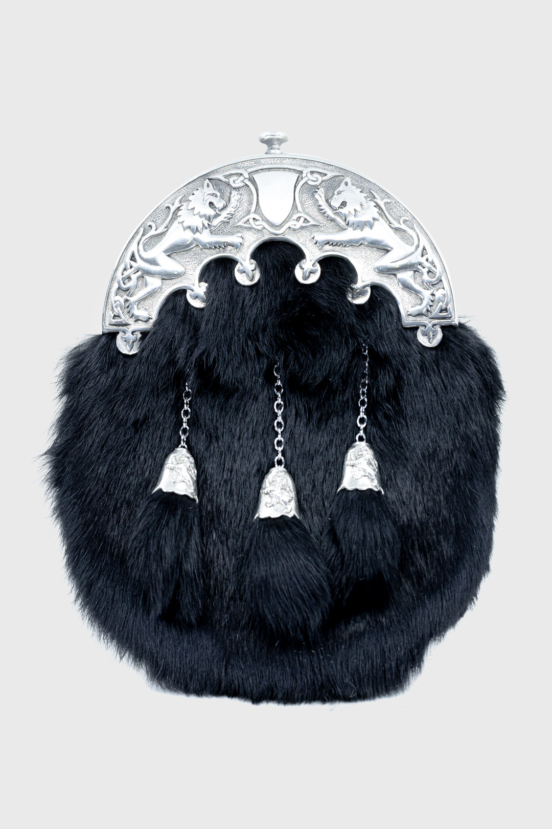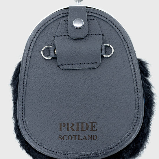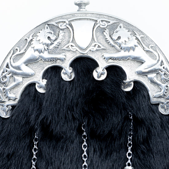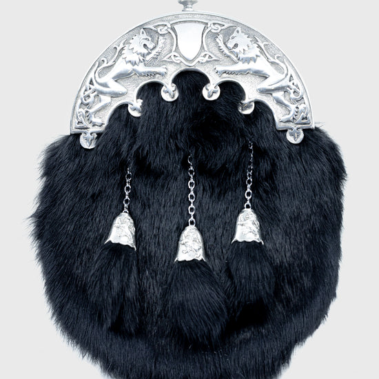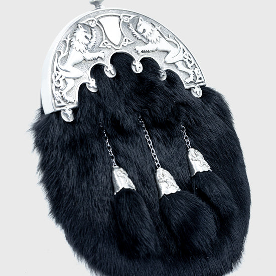This elegant Black Rabbit Fur Dress Sporran is handcrafted from soft rabbit fur and finished with an antique-style pewter Pride of Scotland lion rampant cantle, symbolising Scottish heritage and pride. The design is completed with three straight tassels and matching cone tops, creating a refined and traditional Highland look.