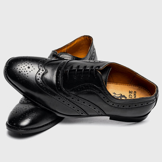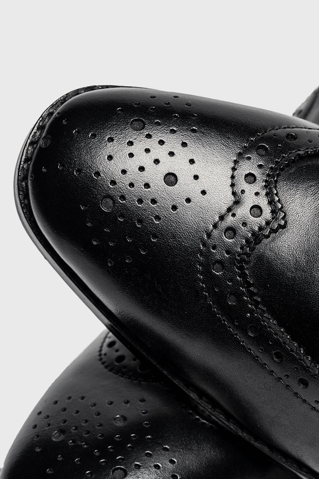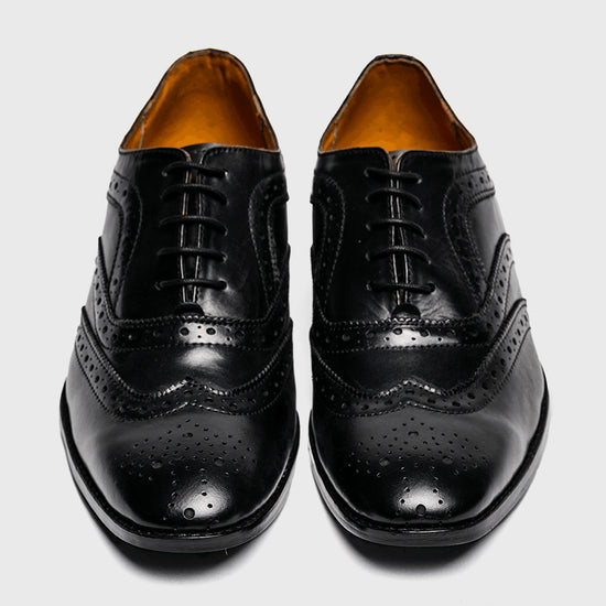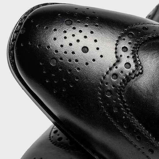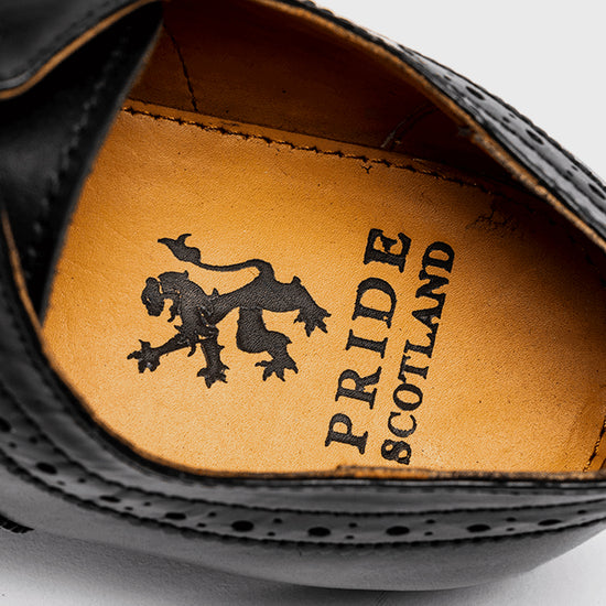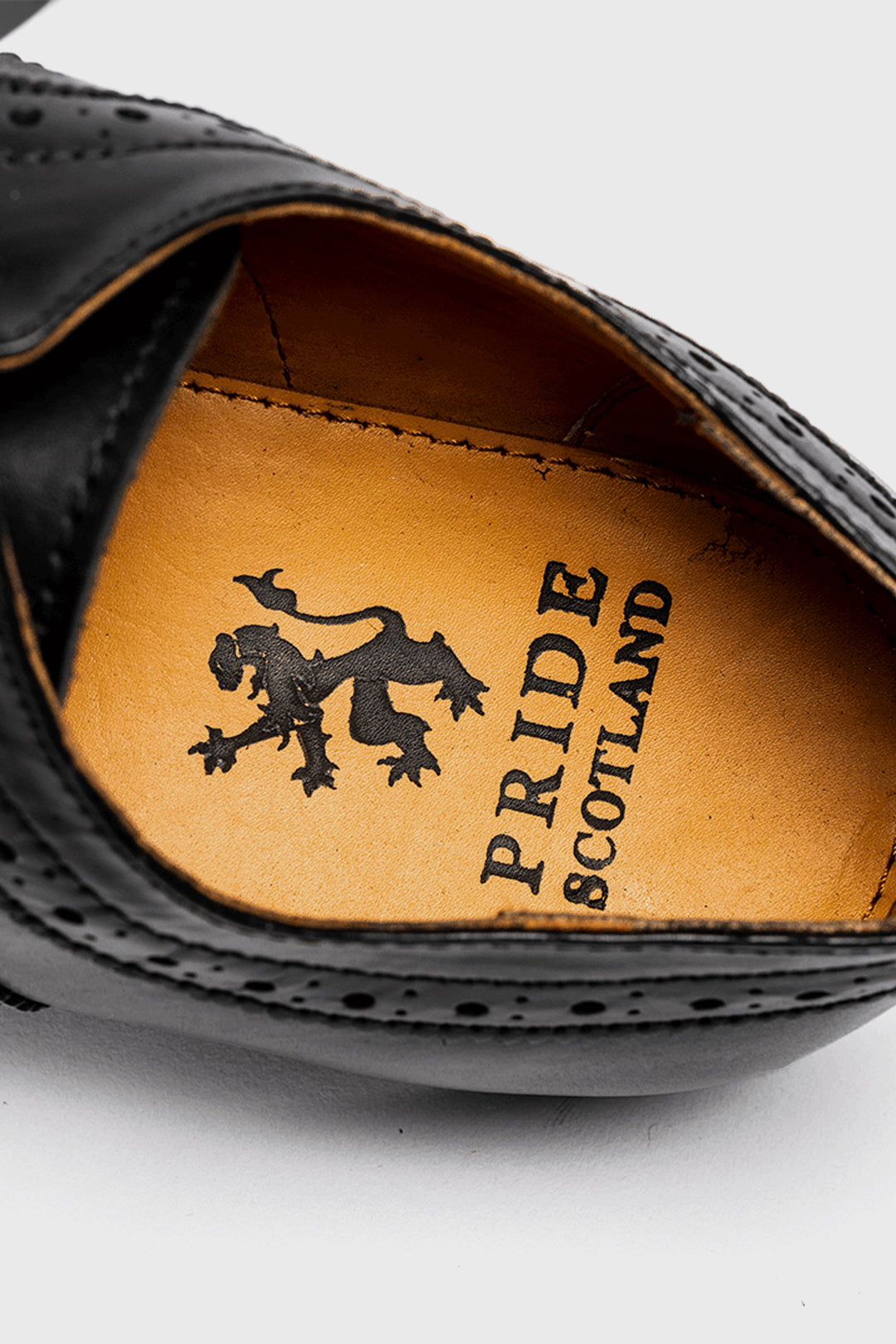 A true wardrobe staple, this classic day brogue is crafted from smooth black leather and lined with soft suede for all-day comfort. Designed to endure, it features a solid heel base and reinforced toe helps maintain its sharp profile. Versatile, durable, and effortlessly refined — the Pride Black Brogue brings timeless craftsmanship to everyday style.