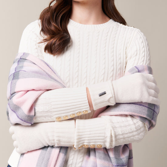 From our exclusive Pride Range, these white gloves are woven in a 70% wool, 30% cashmere mix for a luxuriously soft and cosy feel. Finished with a metal bar tag, they bring understated elegance to your winter wardrobe, making them a refined and practical accessory.