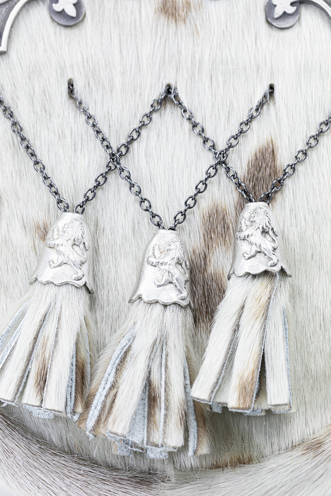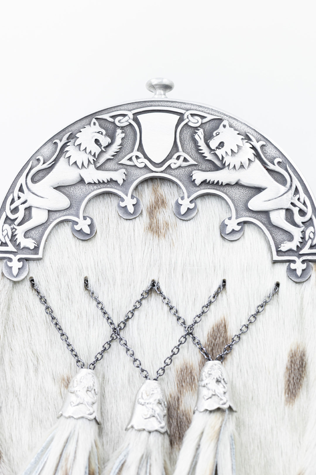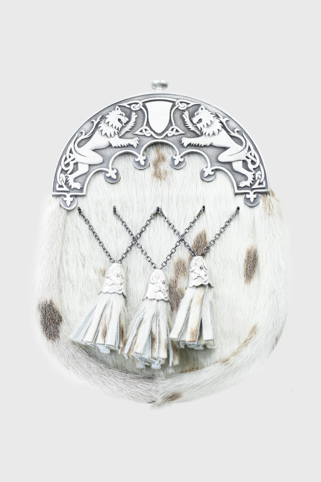 The Pride Sporran in Pewter Matt Grey Seal combines traditional Scottish craftsmanship with refined modern detail. Handcrafted from genuine grey seal skin and finished with a matt pewter cantle, it features the iconic Pride of Scotland lion rampant design. Three cross tassels with matching cone tops complete its classic dress style, offering both elegance and authenticity.