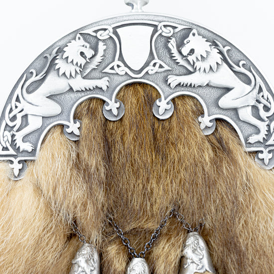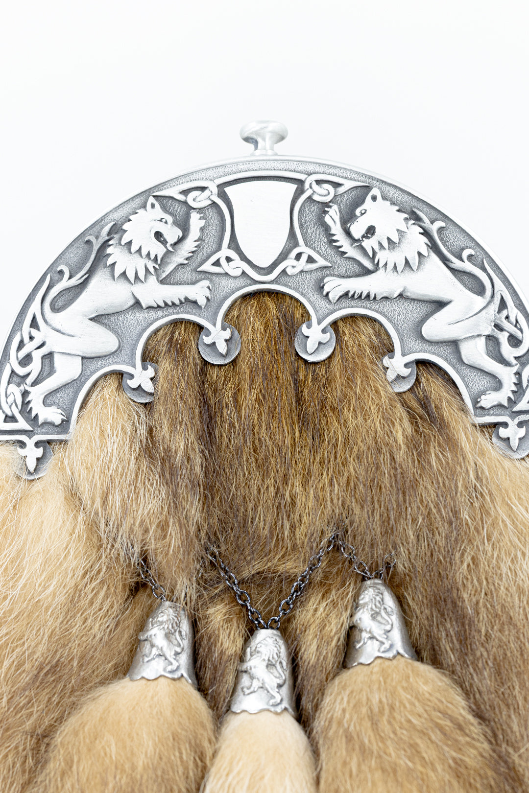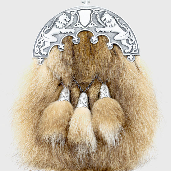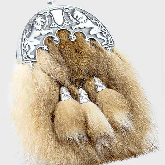 This striking Pride Raccoon Fur Dress Sporran is crafted from luxurious raccoon fur and finished with a detailed cantle, showcasing traditional Scottish design. The natural tones and texture of the raccoon fur create a bold, distinguished look, while the classic tassels add a timeless Highland touch. Perfect for weddings, formal occasions, and ceremonial gatherings, this sporran offers both style and practicality. Supplied with chain straps and a secure fastening, it is an elegant accessory to complete any kilt outfit.