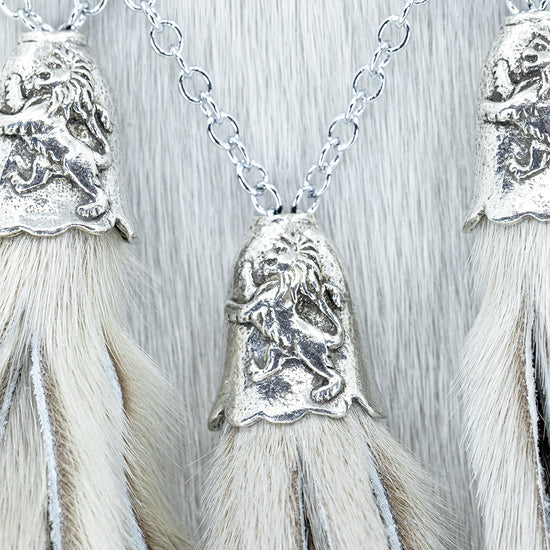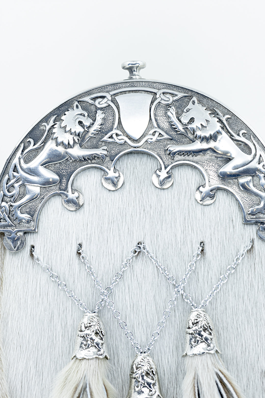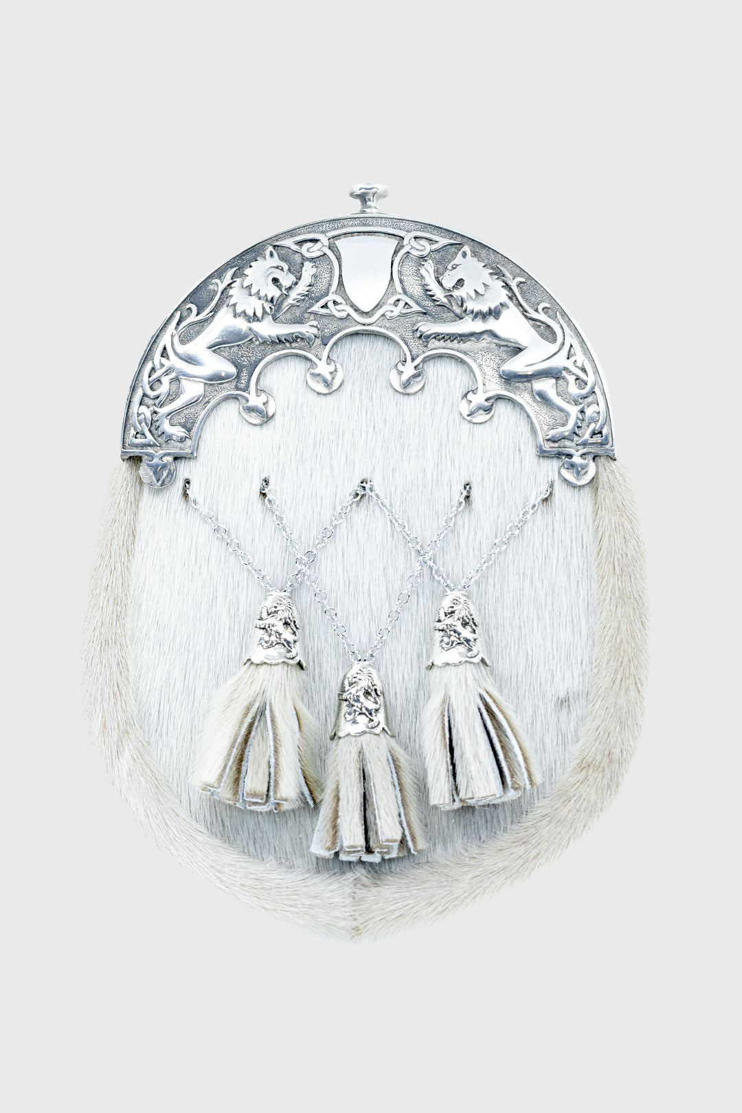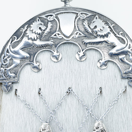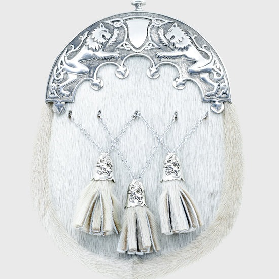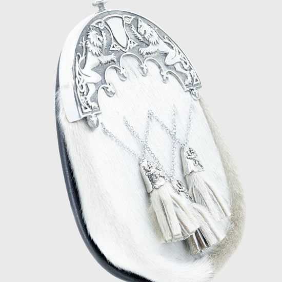 Crafted from genuine grey seal skin, this traditional dress sporran features a polished pewter cantle with the iconic Pride of Scotland lion rampant design. The three crossed tassels with matching cone tops provide a classic finishing touch, making this sporran ideal for weddings, formal events, and Highland gatherings.