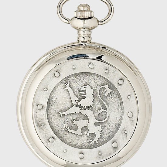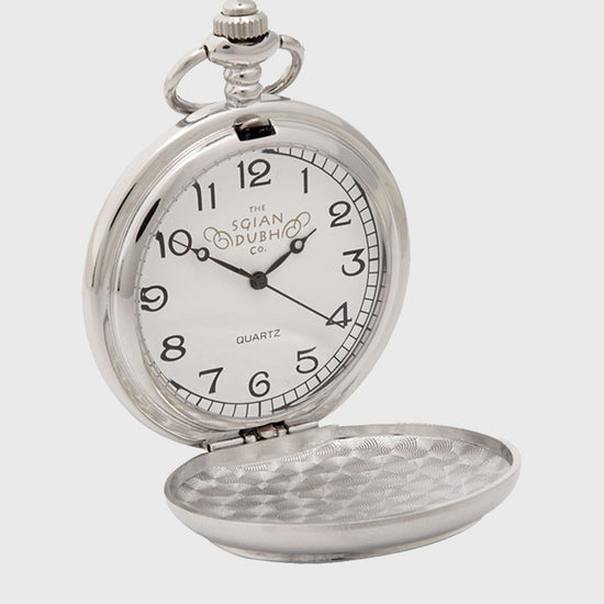 This elegant pocket watch will enhance any kilt or other dress outfit. The quartz watch is a half hunter - one side opens.