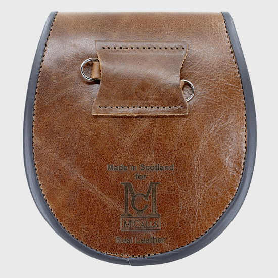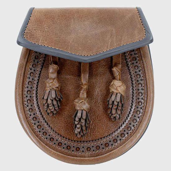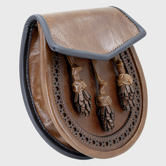A brown leather day sporran, featuring scalloped brogued detailing on the pouch and finished with three matching tassels for a balanced, traditional look. Blending classic design with everyday practicality, this sporran is an ideal choice for both formal and semi-formal wear.