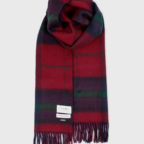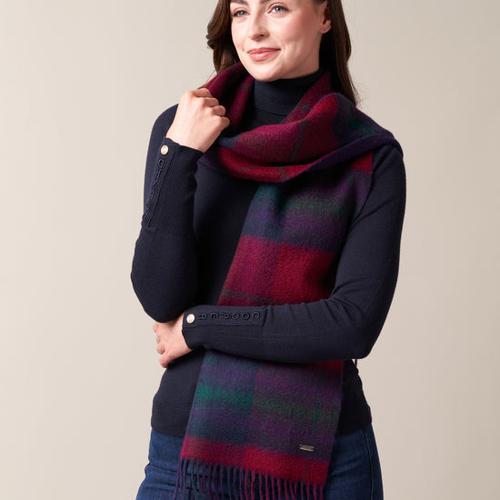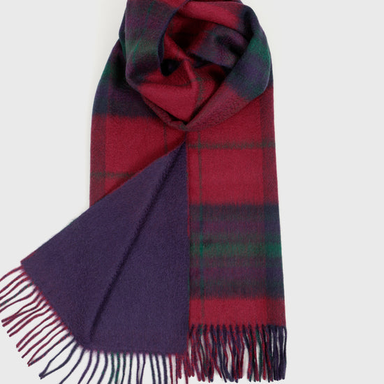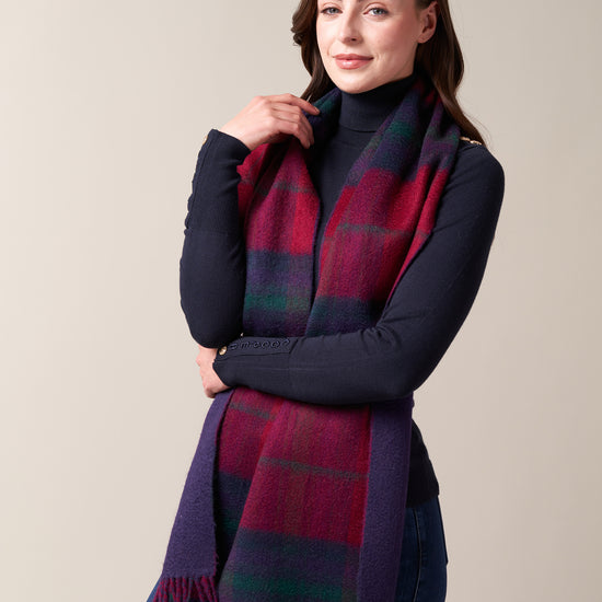 The Double Faced Autumn Pride & Purple Scarf offers two stylish looks in one, crafted from a luxurious blend of 90% wool and 10% cashmere for natural warmth, softness, and lasting comfort. One side features the rich tones of the Autumn Pride tartan in burgundy, navy, dark red, and dark green, while the reverse shows a solid navy finish, giving you the freedom to switch between bold pattern and understated style.