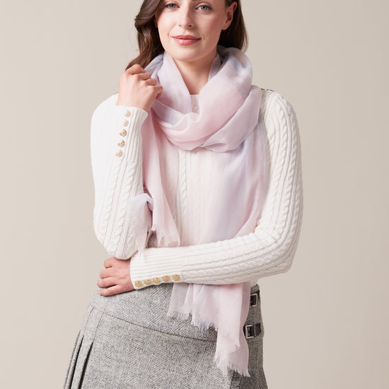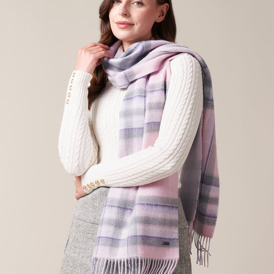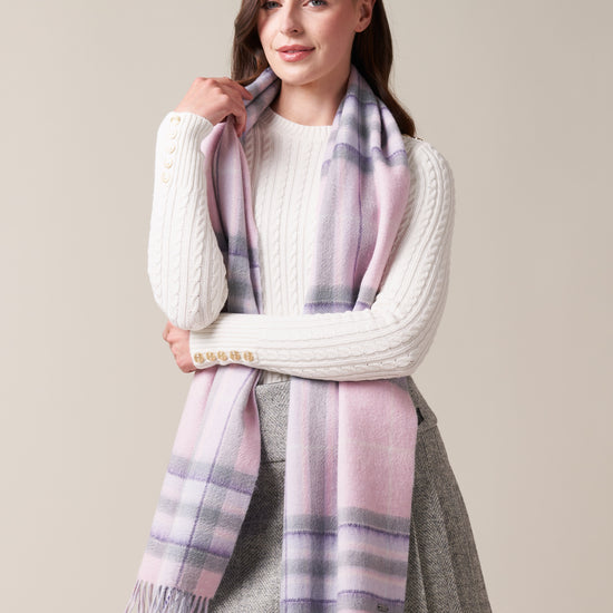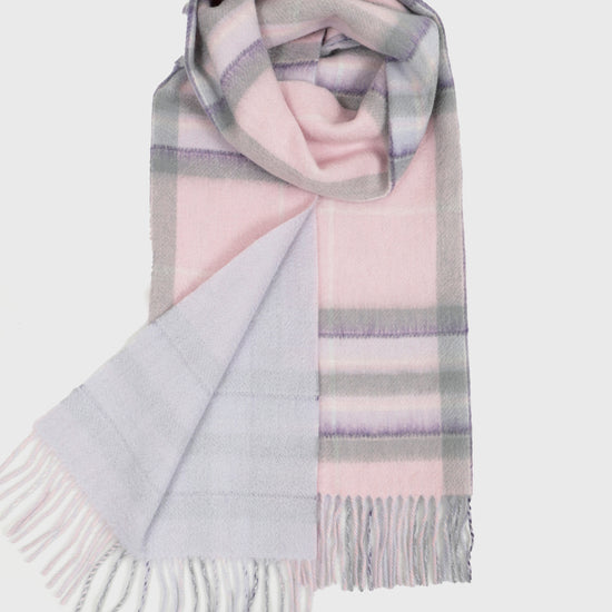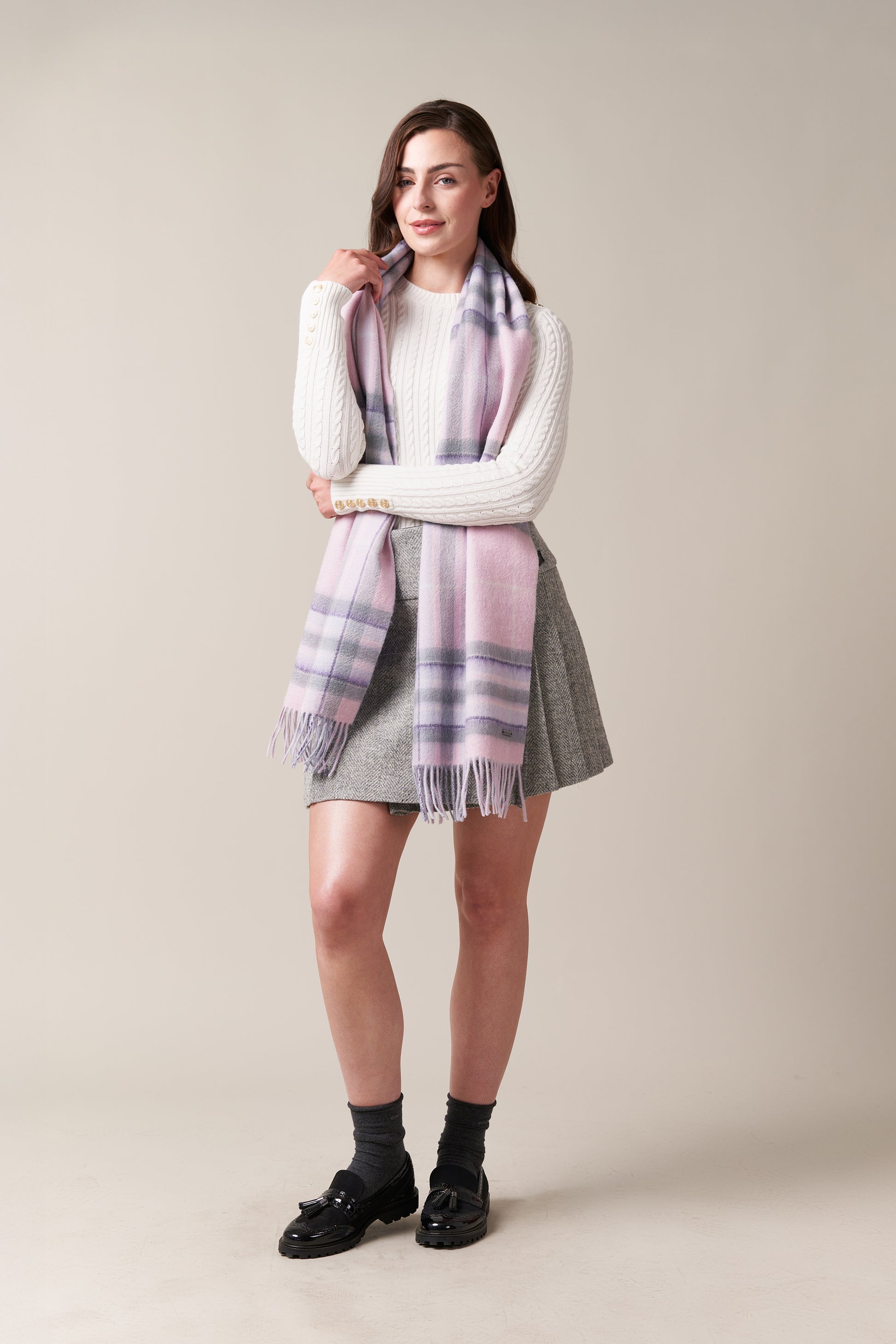 The Double Faced Cherry Blossom Pride & Grey Scarf offers two stylish looks in one, crafted from a luxurious blend of 90% wool and 10% cashmere for softness, warmth, and lightweight comfort. One side features the delicate Cherry Blossom Pride tartan in light pink with accents of grey and blue, while the reverse showcases a plain grey finish, giving you the choice between a patterned or understated style.