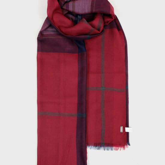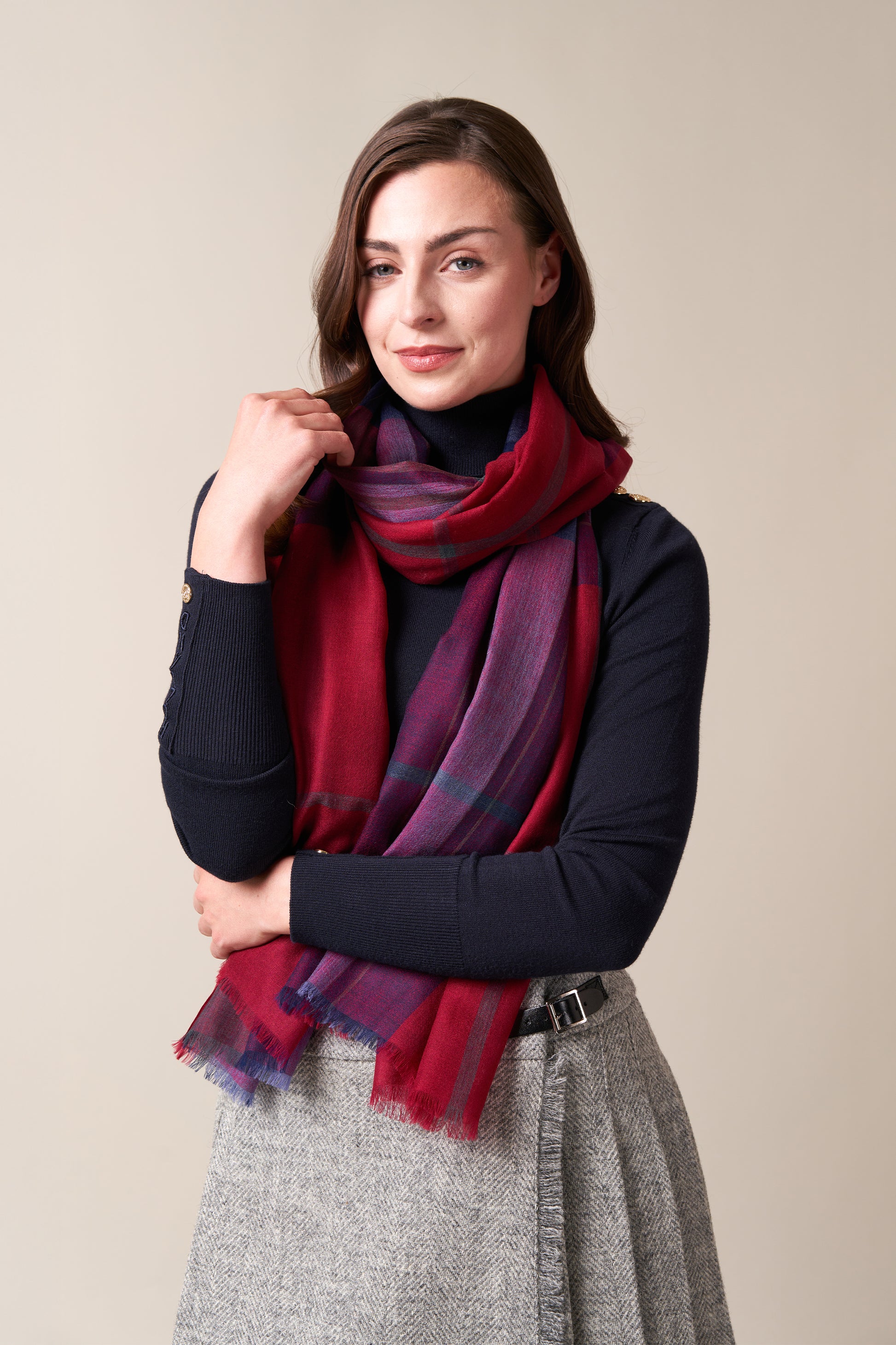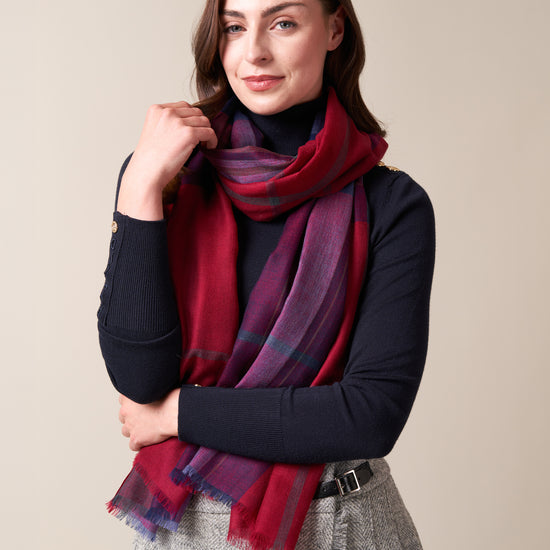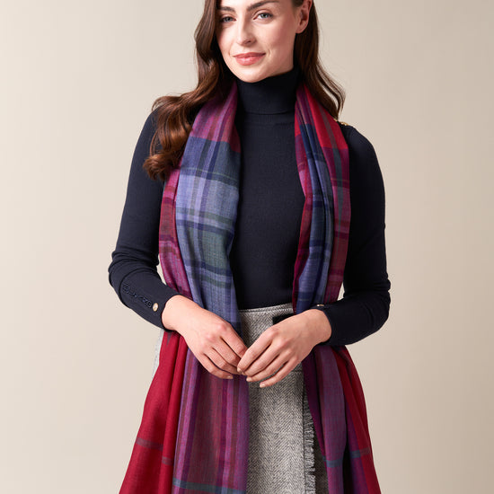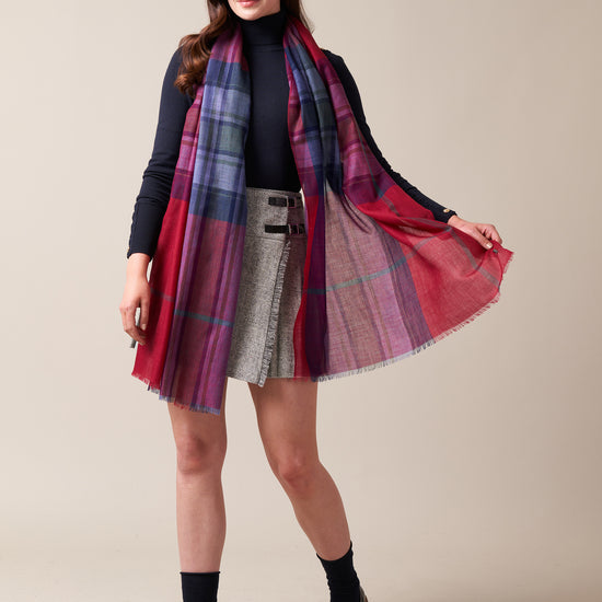 The Merino Wool Autumn Pride Scarf is woven in a rich tartan of burgundy, navy, deep red, and soft pink accents, creating a striking and versatile accessory. Made from 100% merino wool, it offers a luxuriously soft feel, natural warmth, and lightweight breathability for comfortable wear in every season.