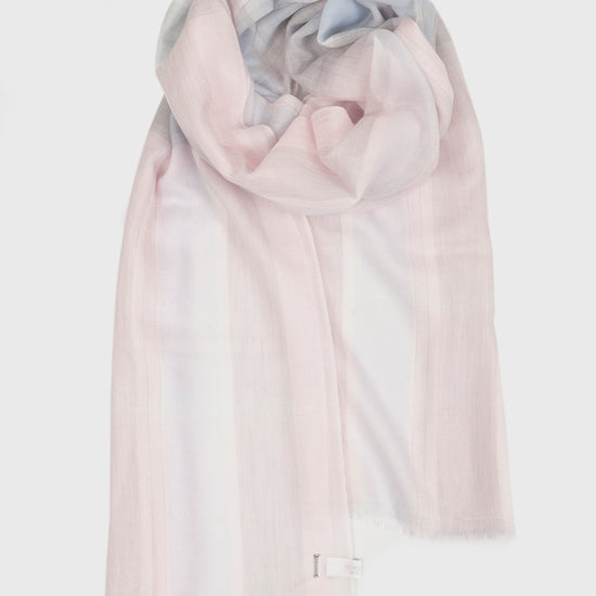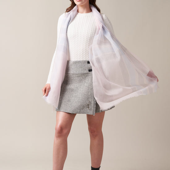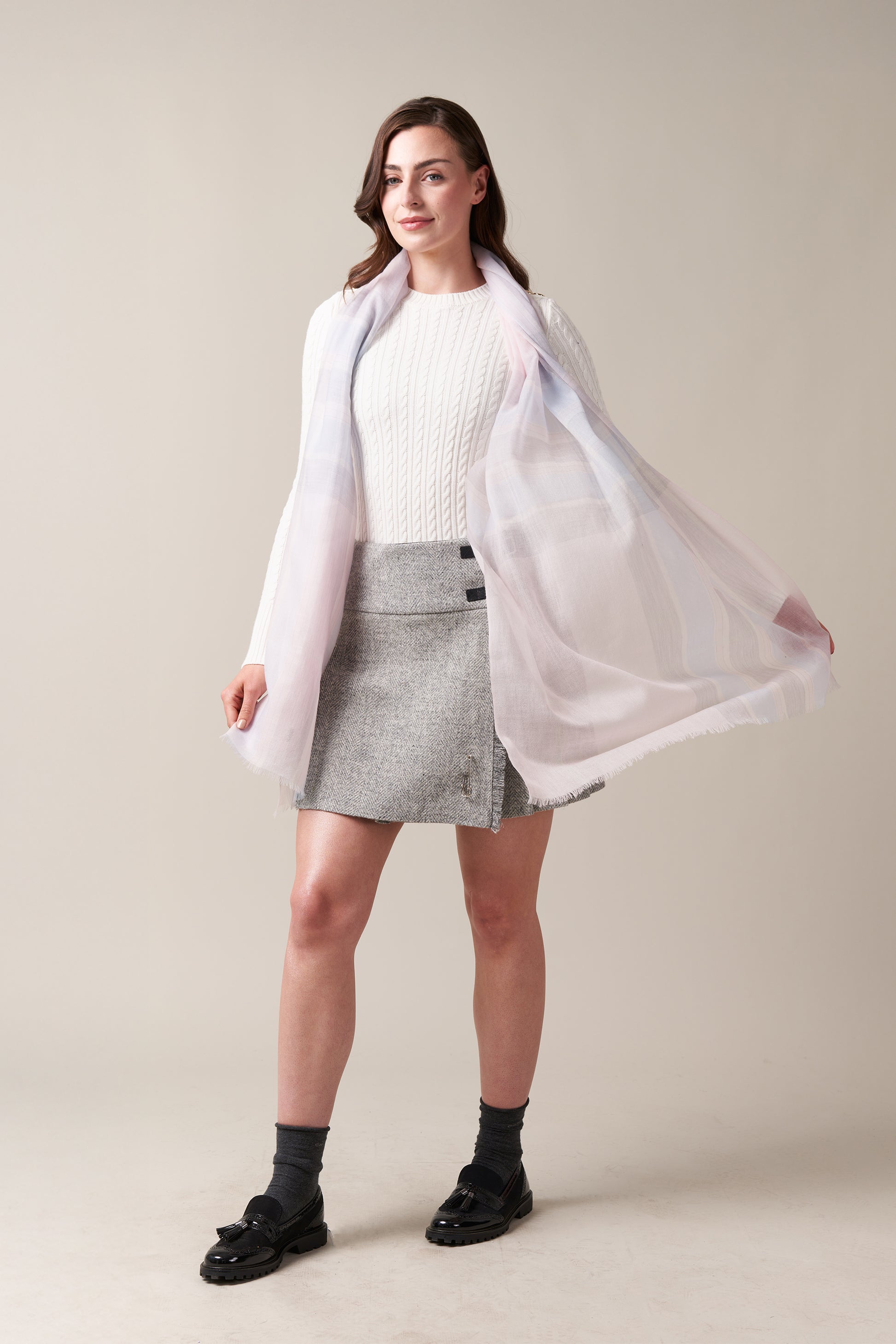 Add a touch of softness and heritage to your wardrobe with this Merino Wool Cherry Blossom Pride Scarf, woven in a delicate light pink tartan accented with grey and blue tones. Crafted from 100% merino wool, it is luxuriously soft, naturally warm, and breathable, making it a versatile accessory for every season.
