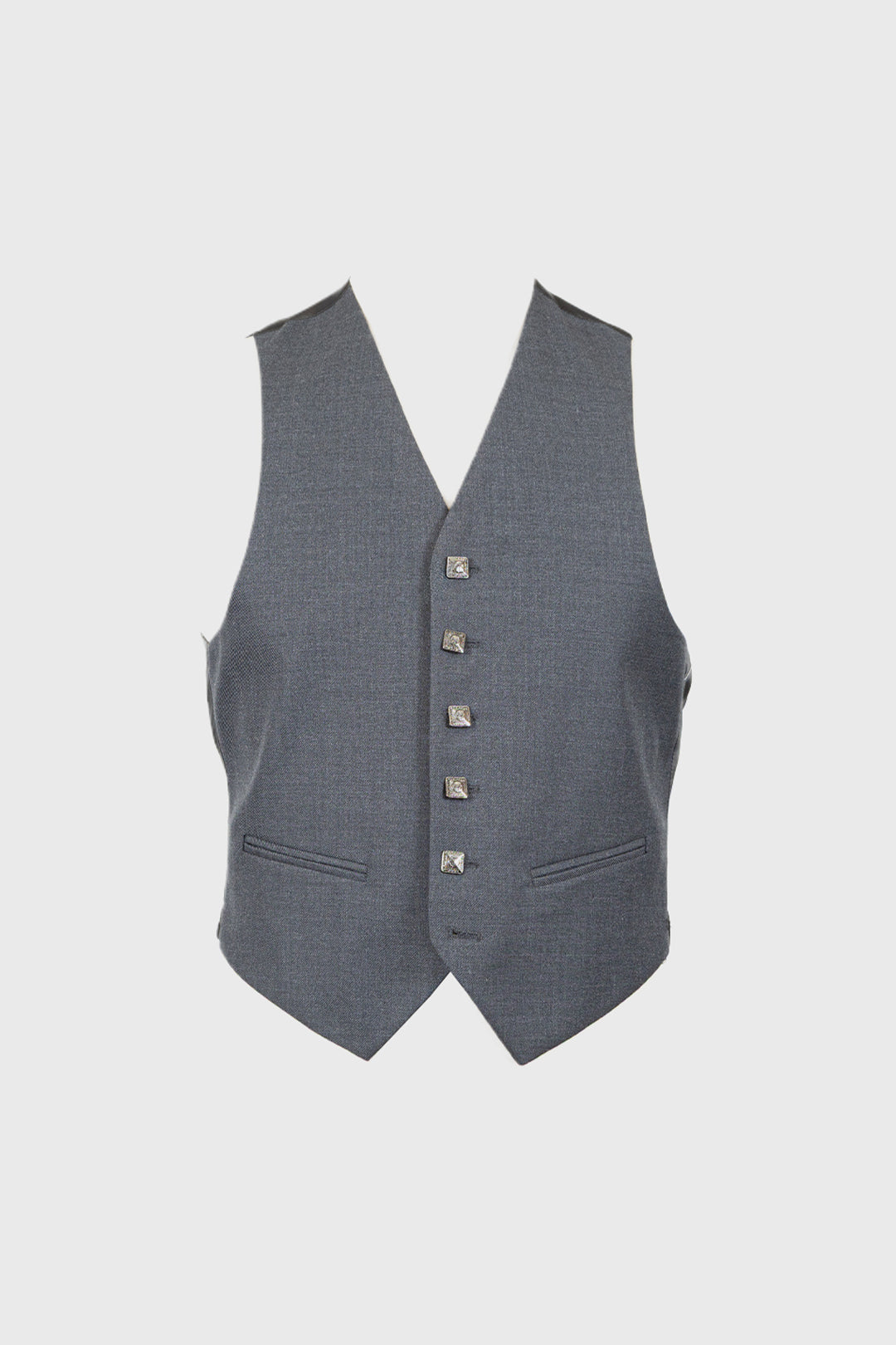 Contemporary silver grey waistcoat. Five-button waistcoat with square silver traditional buttons. Dark grey/silver fabric is used on the back of the waistcoat.