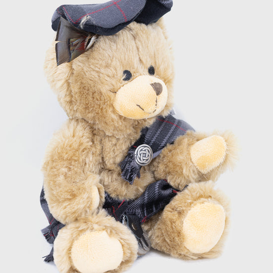 Highlander teddy bear in Silver Pride of Scotland tartan kilt, plaid, hat, with sporran. A perfect Highland gift or Scottish souvenir.