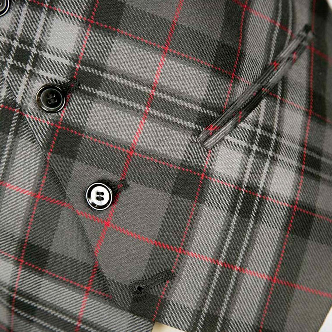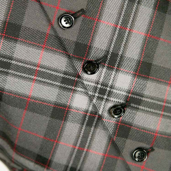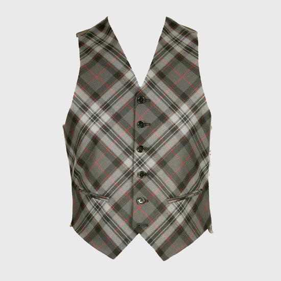 A cut on the cross Silver Pride tartan waistcoat with 6 buttons and 2 low jetted pockets. To be worn with high-rise waisted trews or kilt.