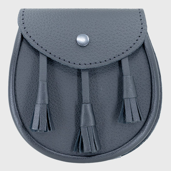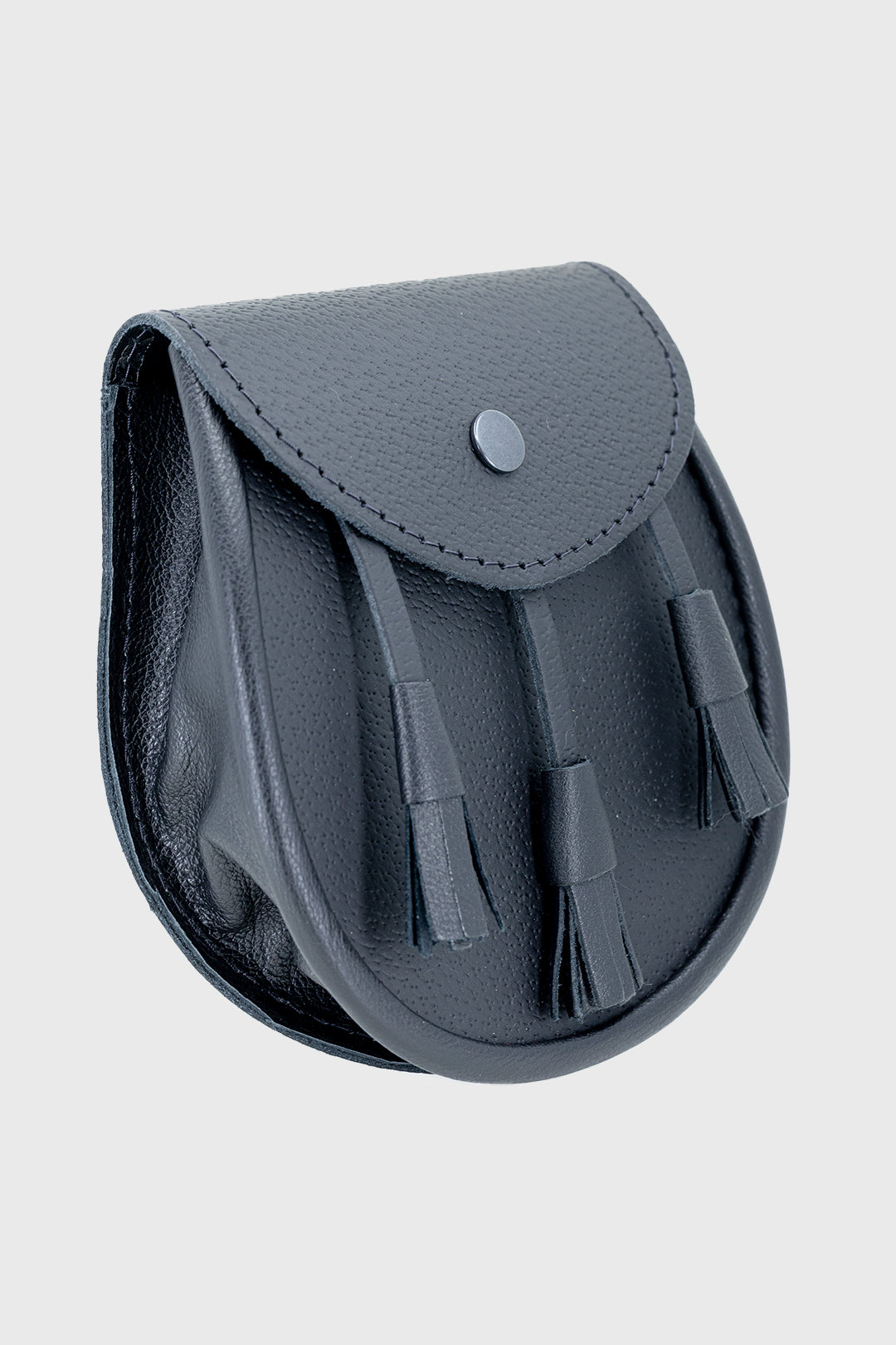 A classic black sporting day sporran, crafted from supple leather with a clean, unlined finish. Designed for active wear with kilts, it features the traditional three tassels, neatly suspended from leather for a balanced and elegant look without unnecessary ornamentation.