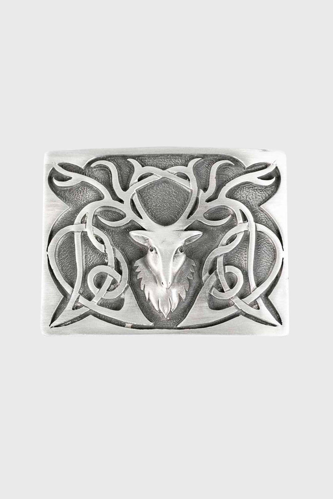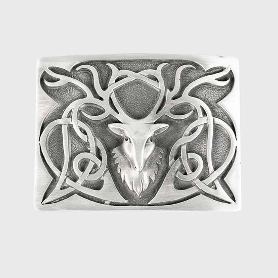 Antique finish pewter buckle with a prominent stag head and art nouveau/Celtic swirls coming from the antlers.
