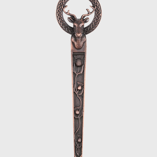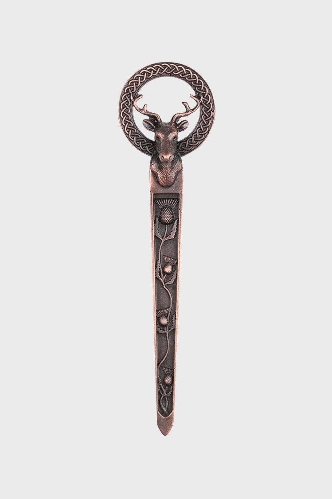 This Stag and Thistle kilt pin is expertly crafted from pewter to celebrate the wild elegance of the Scottish Highlands. Featuring a gracefully climbing thistle motif that leads to a finely detailed stag’s head adorned with intricate Celtic knotwork, this kilt pin combines traditional craftsmanship with timeless Scottish symbolism. Each kilt pin is handcrafted and available in Copper, Antique and Polished finishes