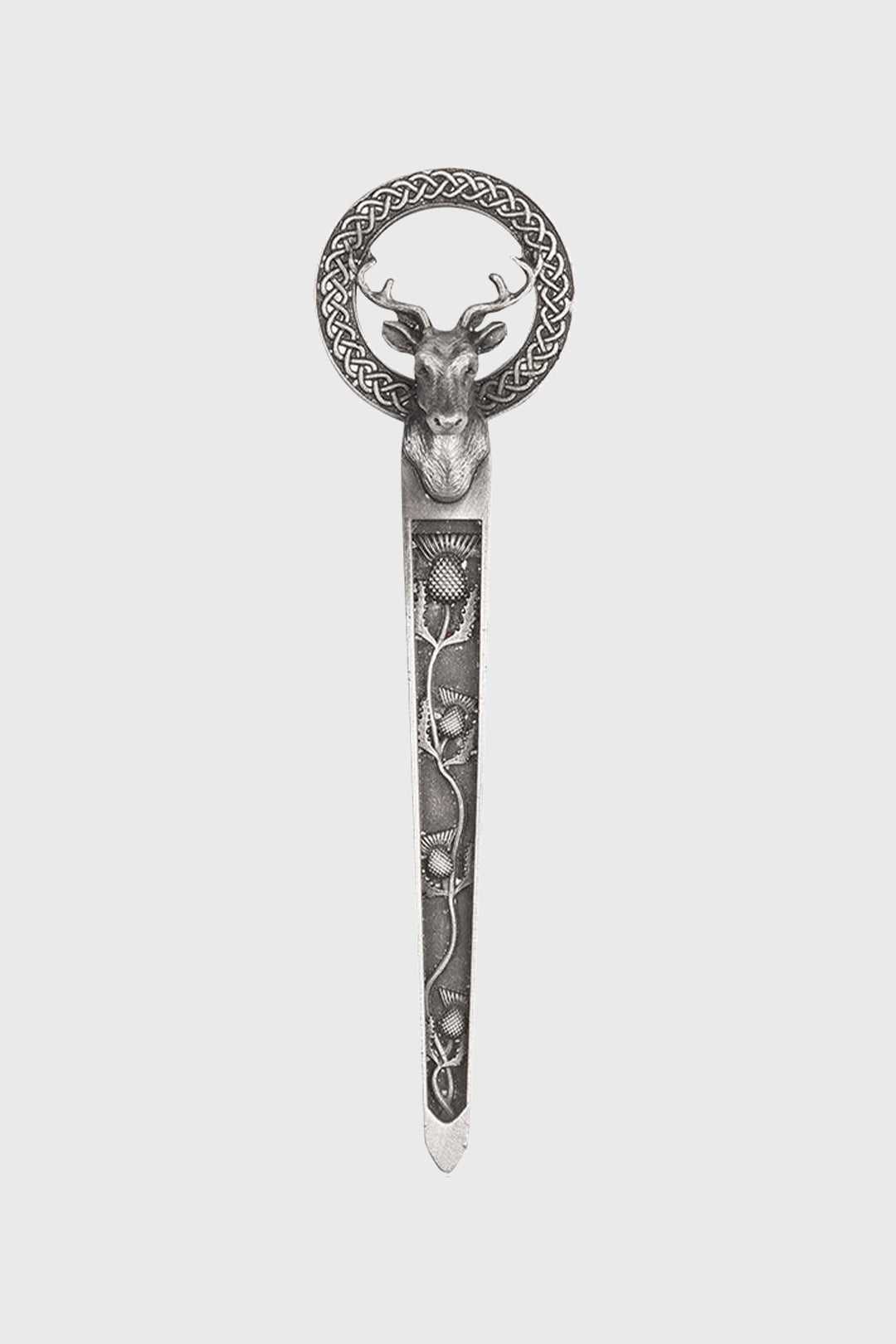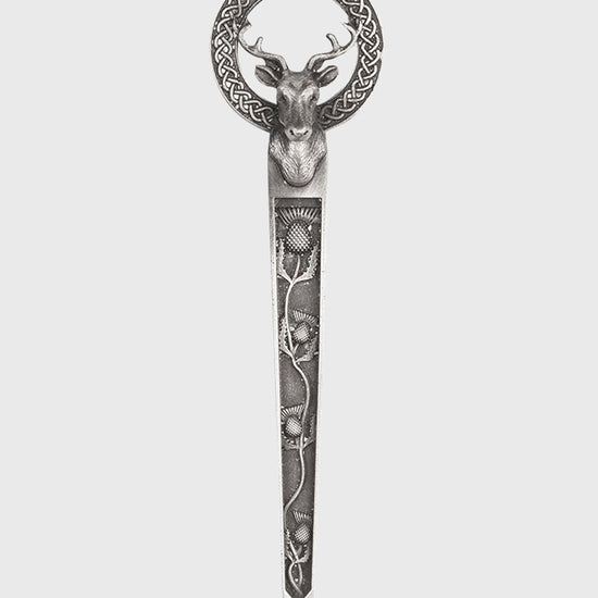 This Stag and Thistle kilt pin is expertly crafted from pewter to celebrate the wild elegance of the Scottish Highlands. Featuring a gracefully climbing thistle motif that leads to a finely detailed stag’s head adorned with intricate Celtic knotwork, this kilt pin combines traditional craftsmanship with timeless Scottish symbolism. Each kilt pin is handcrafted and available in Copper, Antique and Polished finishes