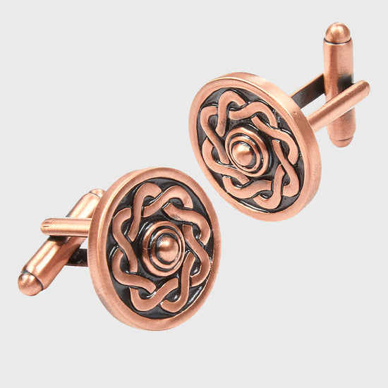 Cufflinks with a celtic targe centre. Pewter silver intricate design with copper finish.