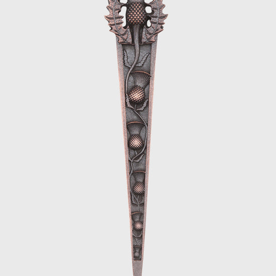 The Thistle Pewter Kilt Pin, a beautifully handcrafted kilt accessory that combines elegance with tradition. Featuring a creeping thistle motif that ascends the length of the pin and culminating in a detailed Celtic knotwork circle, this kilt pin symbolises resilience, strength, and the enduring beauty of Scotland.