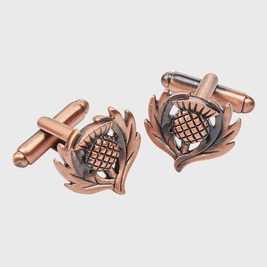 Cufflinks in the shape of a Scottish thistle. Pewter silver intricate design with copper finish.