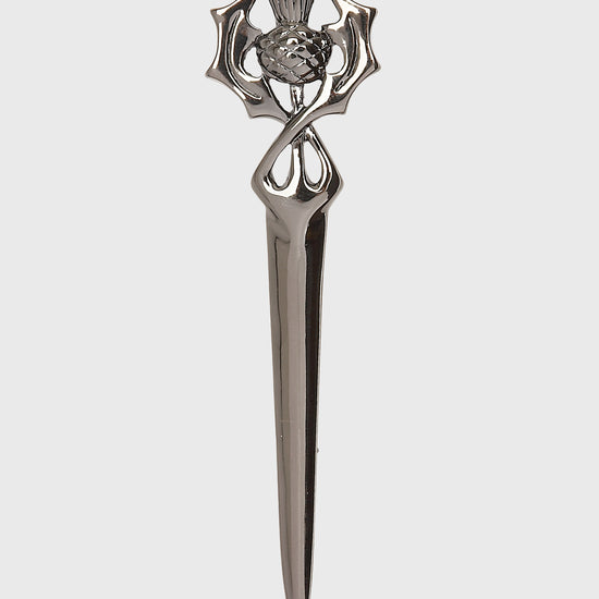 This kilt pin features a detailed thistle top secured with twisted leaves.